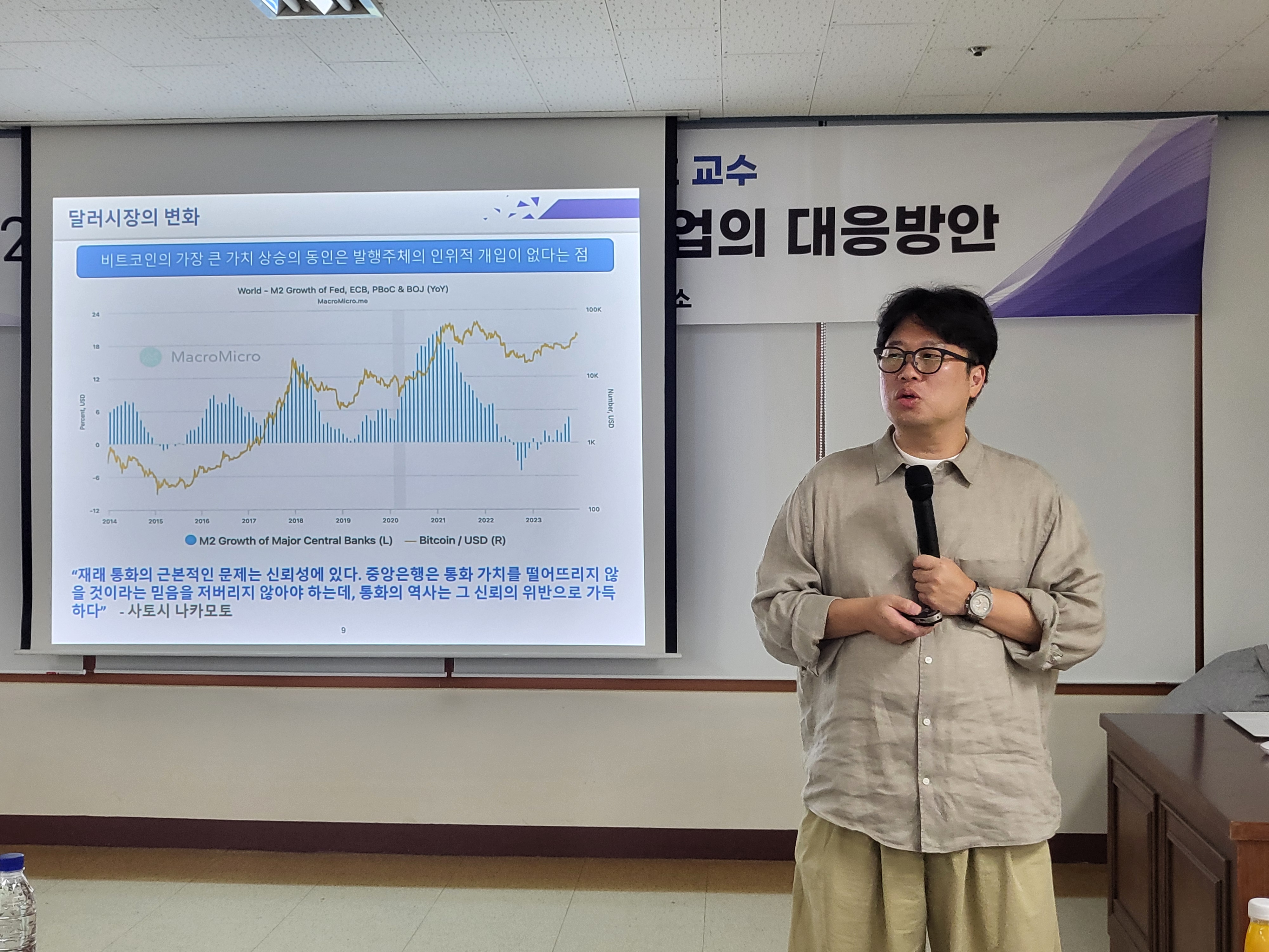강사로 나선 박정호 특임교수는 트럼프 당선 이후 경제 환경 변화와 급격한 관세전쟁으로 인한 미중 갈등은 어떻게 전망하고 대비하여야 하는가?에 대해 말하고, 비트코인으로 인한 달러시장의 변화와 향후 미래의 통화시장을 이끌수도 있는 스티이블코인 등을 경제환경에 다가온 예시를 들며 설명하였다. 또한 브릭스 회원국의 약진으로 인한 '카잔선언'과 자체 무역통화인 '브릭스 유닛' 도입을 추진하고 있는 배경과 이로 인한 새로운 통화체계의 대비를 해야 한다고 말하였다. 네이버와 두나무의 합병, 그리고 사기업의 원화 스테이블 코인 등을 설명하며, 우리나라도 더이상 가상화폐 시장을 관망하지말고 대비하고 정책적인 접근이 필요하다고 말하였다. |