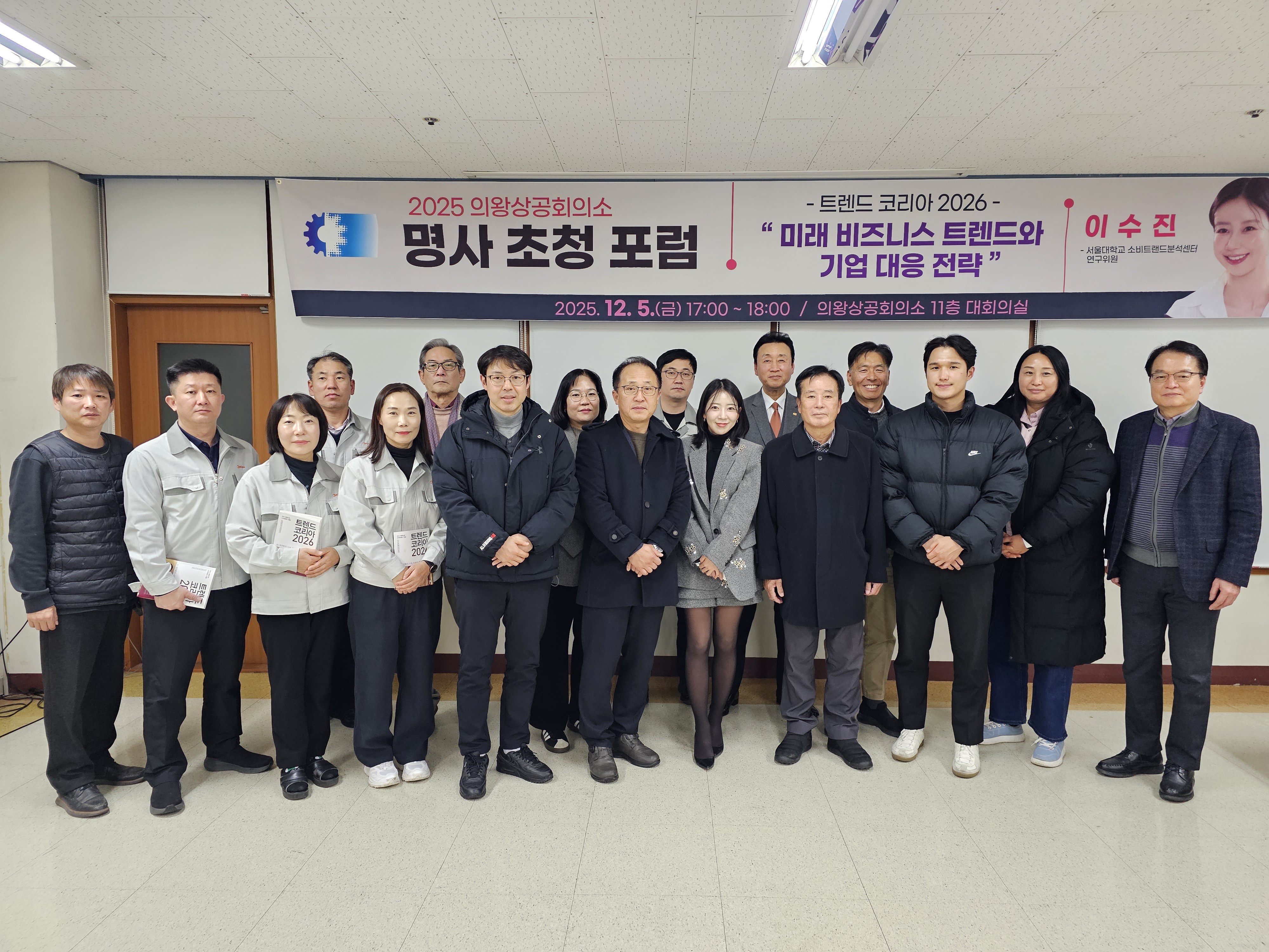 의왕상공회의소(회장 안효철)는 12월 5일(금) 17시 대회의실에서 서울대학교 소비트렌드 분석센터 이수진 연구위원을 초청하여 ‘미래 비즈니스 트렌드와 기업 대응 전략 이라는 주제로 마지막 명사초청포럼을 진행하였다. 의왕상공회의소 안효철 회장은 “급변하는 사회 트렌드를 기업들이 혜안을 가지고 알찬 한 해를 꾸릴 수 있도록 ‘트렌드코리아 2026’ 강연을 준비했다고 밝혔다. 이날 강연에서는 10대 트렌드인 ‘HORSE POWER’을 중심으로 ▲휴먼인더루프 ▲필코노미 ▲제로클릭 ▲레디코어 ▲AX조직 ▲픽셀라이프 ▲프라이스 디코딩 ▲건강지능HQ ▲1.5가구 ▲근본이즘 등 대한민국의 변화를 추동할 사회현상을 미리 살펴보는 시간을 가졌다. AI의 발전이 가져온 기업의 변화에서 소비자가 느끼는 트렌드의 변화는 과거의 속도보다 훨씬 빠르게 확산되고 소멸된다고 전하며 이 기류의 흐름을 잘 파악해야 한다고 하였다. 향후의 트렌드의 중심에는 AI가 선택이 아닌 생존의 조건이며, 기업은 조직 개편의 일상화를 통해 흐름을 선도화해야하며, AI활용 능력과 실무를 직접 수행하는 임직원이 분리되어 전문성을 강화해야 한다고 하였다. 세계적인 OPEN AI인 ChatGPT5도 리뷰어의 의견에 즉각 반응하여 새로운 버전을 출시할만큼 트렌드의 속도는 빠르다못해 실시간이라는 점도 강조하며, 우리나라 기업의 수직적인 체계의 변화를 강조하였다 흐름을 읽어도 변화하지 않는다면 기업은 더 이상의 성장이 어려울것이라고 전망했다
